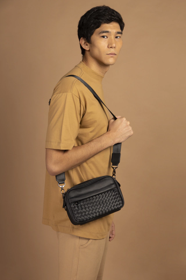 Polyester and PU bag (synthetic leather), steel trimmings and stretching handle. It has two external pockets, and two internal, one with zipper.